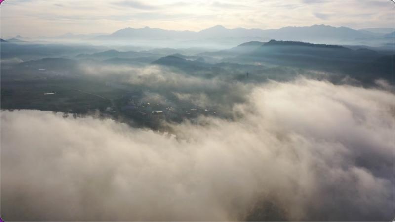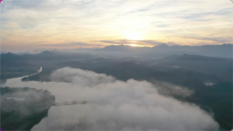 清晨时分,修河澧溪下坊大坝上游水面上雾气渐起,随后在上空会聚成大片云雾,构成今冬初次大规模平流云现象。乳白色的云雾宛如游龙,沿弯曲河道慢慢前行,时而环绕山峦,时而轻拂水面。在晨光照射下,云层如波澜翻涌,蔚为壮丽。远山如黛,近水含烟,活动的云雾与碧绿河水、沿岸村庄彼此衬托,构成一幅生动的山水画卷。